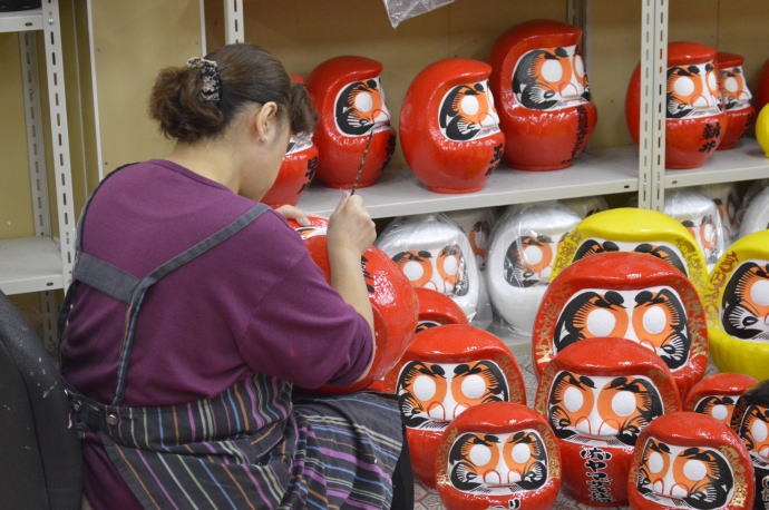 高さ6cm〜75cmの全18サイズのダルマがあり、11色のカラーバリエーションもあるので、名入れをしたオリジナルのダルマを制作することが出来ます。一つ一つ手作業にて気持ちを込めたダルマです。年中ご注文をお受けしております。